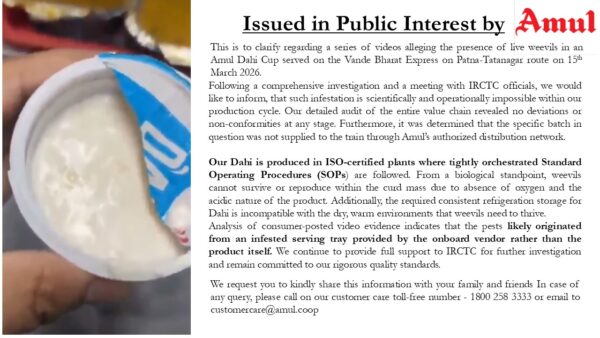 PATNA. पटना-टाटानगर वंदे भारत एक्सप्रेस में परोसे गये दही में कीड़ा पनपने की शिकायतों पर प्रमुख डेयरी ब्रांड अमूल ने स्पष्टीकरण देते हुए कहा है कि उसके किसी उत्पाद में ऐसा होना असंभव है. IRCTC की ओर से मांगें गये जबाव में कंपनी ने स्पष्ट किया कि जिस दही के बैच की शिकायत सामने आयी है, वह उनके अधिकृत वितरण नेटवर्क के माध्यम से संबंधित ट्रेन में सप्लाई ही नहीं की गयी! कंपनी का कहना है कि जिस उत्पाद को लेकर विवाद खड़ा हुआ, वह अमूल की आधिकारिक सप्लाई चेन से जुड़ा नहीं था. अमूल के इस बयान से जांच की पूरी दिशा ही बदलने की संभावना बनने लगी है.