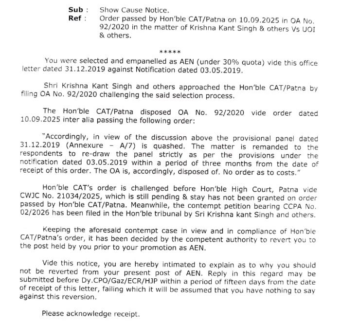 प्रक्रिया के बाद एक आरक्षित पद पर रिक्त रहने स्थिति में कुल 13 नवनियुक्त सभी सहायक मंडल अभियंताओं की पोस्टिंग कर दी गयी और इस तरह इन लोगों ने 2026 तक 6 वर्ष की सेवा भी पूरी कर ली है. ऐसे में इन्हें एक वेतन उन्नयन  का लाभ भी मिल चुका है. यहां तक तो सब फील गुड चल रहा था. अचानक बीते इसी माह ECR कार्मिक विभाग ने CAT के एक निर्णय का हवाला देकर पदोन्नति पाकर छह साल से निर्विवाद काम करने वाले सभी 13 सहायक अभियंताओं को नोटिस भेजकर स्पष्टीकरण मांगा है कि क्यों नहीं उनकी पदोन्नति रद्द कर उन्हें पुराने पद पर वापस भेज दिया जाये ? मजे की बात यह कि सभी 13  सहायक अभियंताओं को Revert करने का निर्णय की सूचना उनके कैडर कन्ट्रोलिंग अधिकारी PCE/ECR तक को नहीं दी गयी.