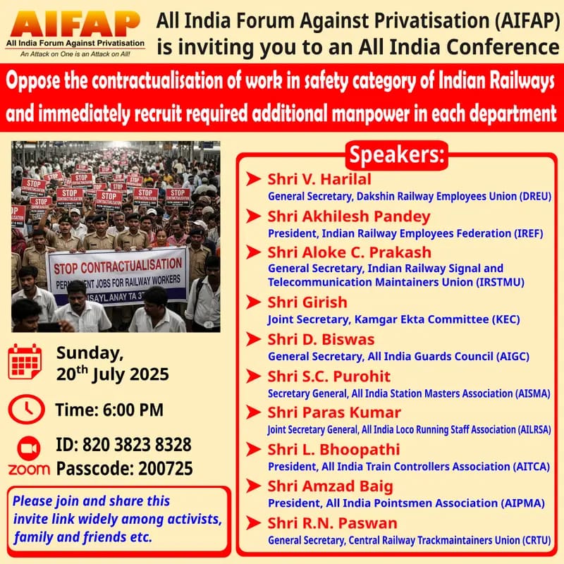 NEW DELHI. “सर्व हिंद निजीकरण विरोधी फोरम” (AIFAP) द्वारा भारतीय रेलवे की सुरक्षा श्रेणी में ठेकाकरण का विरोध और प्रत्येक विभाग (विशिष्ट रूप से सिगनल एवं टेलिकॉम विभाग) में आवश्यक अतिरिक्त कर्मचारियों की तत्काल भर्ती के लिए एक ऑनलाइन मिटिंग का आयोजन किया गया जिसमें भारतीय रेलवे के सात कैटेगरीकल संगठनों समेत कई संगठनों, इंडियन रेलवे सिग्नल एंड टेलीकम्यूनिकेशन मेंटेनर्स यूनियन (IRSTMU), इंडियन रेलवे एम्प्लाइज फेडरेशन (IREF), कामगार एकता कमिटी (KEC), ऑल इंडिया गार्ड्स काउंसिल (AIGC), ऑल इंडिया स्टेशन मास्टर्स एसोसिएशन (AISMA), ऑल इंडिया लोको रनिंग स्टाफ एसोसिएशन (AILRSA), ऑल इंडिया ट्रेन कंट्रोलर्स एसोसिएशन (AITCA), ऑल इंडिया पॉइंट्समैन एसोसिएशन (AIPMA), तथा ऑल इंडिया रेलवे ट्रैकमेंटेनर्स यूनियन (AIRTU) के प्रतिनिधियों ने भाग लिया.