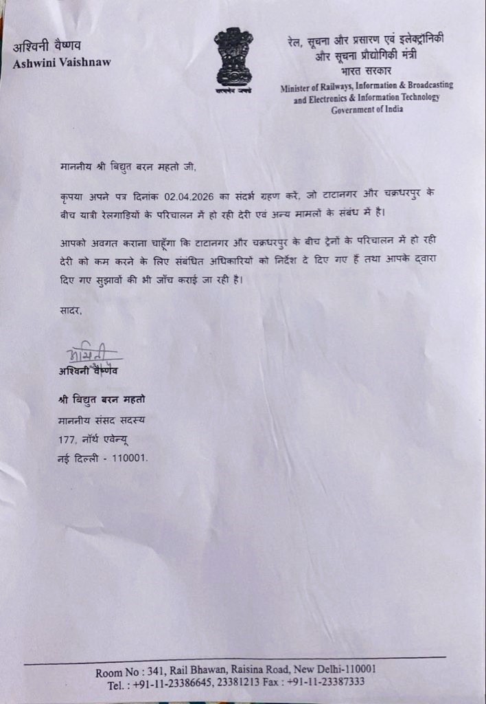 विधायक सरयू राय की धरना की घोषणा और तैयारियों के बीच सांसद विद्युत वरण महतो दिल्ली पहुंच गये. रेलमंत्री से मिले और रेलमंत्री का पत्र लेकर जमशेदपुर लौट आये हैं. सांसद विद्युत वरण महतो ने अपनी पहल को X पर साझा किया और बताया है कि रेलमंत्री से उन्हें ट्रेनों के विलंब होने के कारणों की जांच कराने का आश्वासन मिला है. यही नहीं रेलमंत्री ने चक्रधरपुर डिवीजन के अधिकारियों को इसे लेकर जरूरी निर्देश भी दिया है. सांसद ने रेलमंत्री का पत्र भी X पर साझा किया है.