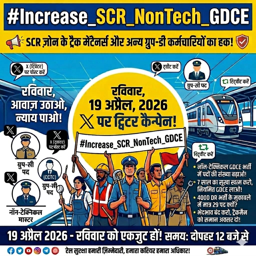 यह अभियान रविवार 19 अप्रैल 2026 की दोपहर 12 बजे से सोशल मीडिया प्लेटफॉर्म ट्विटर (X) पर चलाया जायेगा. इसके साथी ही हैसटेग अभियान भी चलेगा #Increase_SCR_NonTech_GDCE, जिसमें सीट बढ़ोतरी की मांग की जायेगी. अभियान के लिए रेलकर्मियों से सहयोग करने का आह्वान किया गया है. इसके साथ ही अभियान को (X) पर ट्वीट और रि-ट्वीट चलाकर अपनी बात पीएमओ, रेलमंत्री, रेलवे बोर्ड चेयरमैन तक पहुंचायी जायेगी.